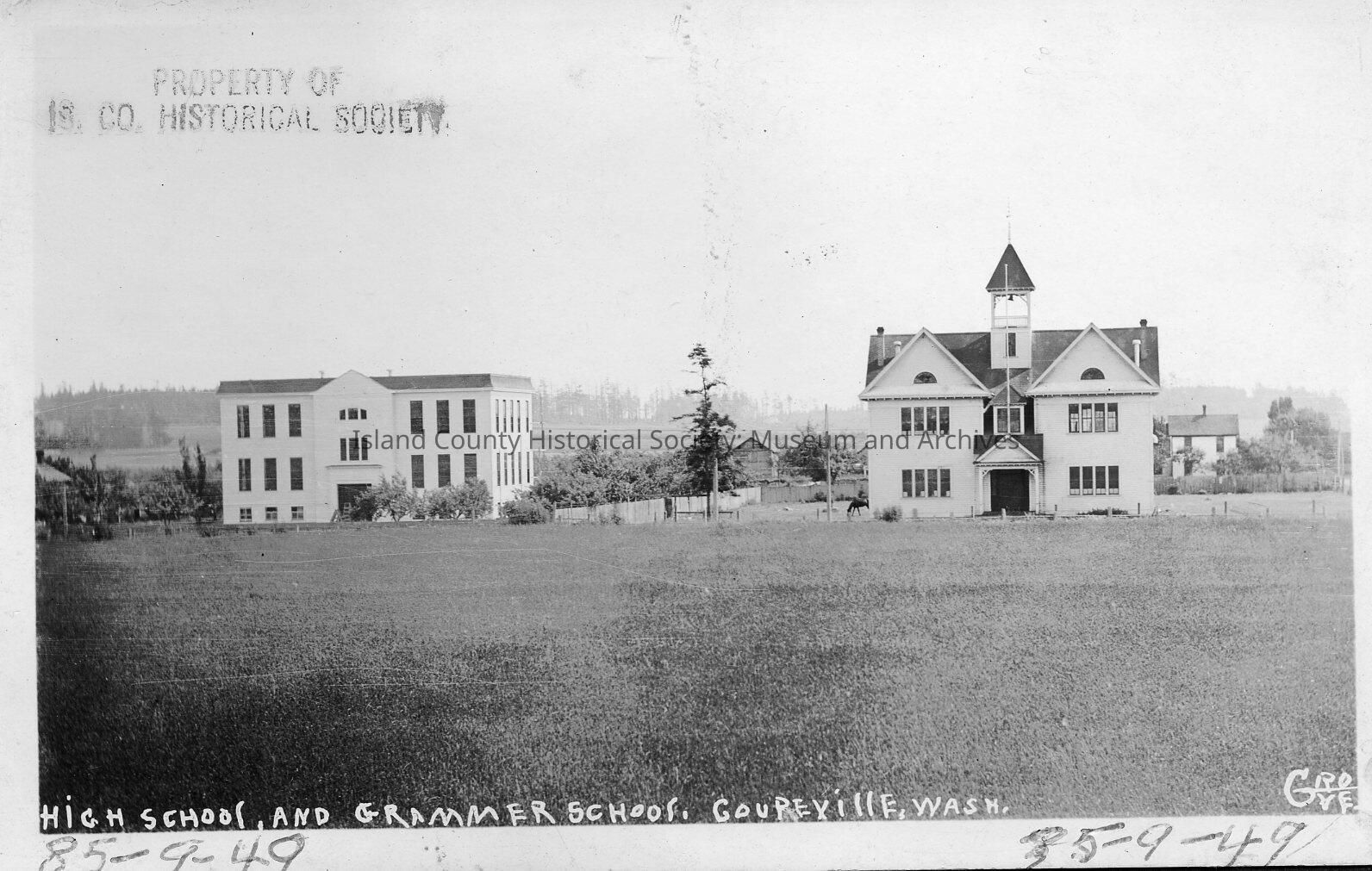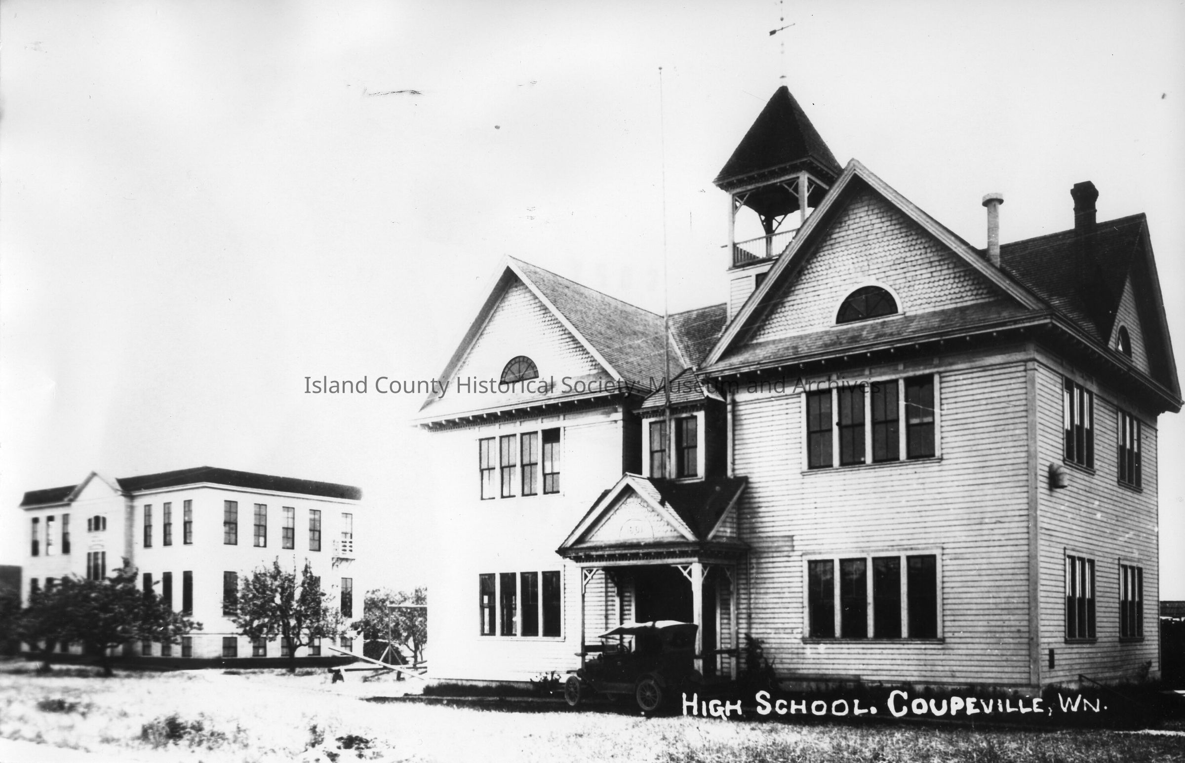 Coupeville High School and Grammar School. Building on left is flat roofed, three story with many windows. On right is older building with peaked roofs and bell tower. Farms are visible in the background.