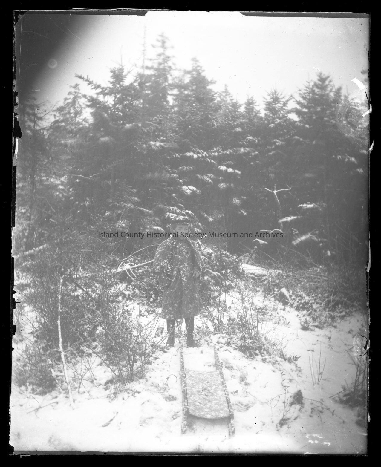 Photo of a young boy in a jacket in the snow with a sled in front of pine trees.Made/Created
