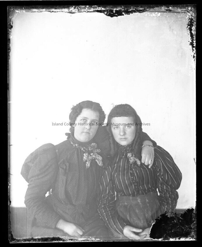 Photo of two women in dresses, the woman on the left has a solid colored dress and the woman on the right has a multiple colored vertical stripped dress. There is damage to the bottom right and top edge of photo.Made/Created