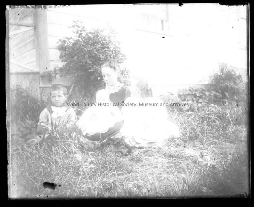 Photo of four children, with the oldest in the middle of the four holding the baby in the grass. The younger boy and girl are sitting on opposite sides of the oldest on the left and right respectively.Made/Created