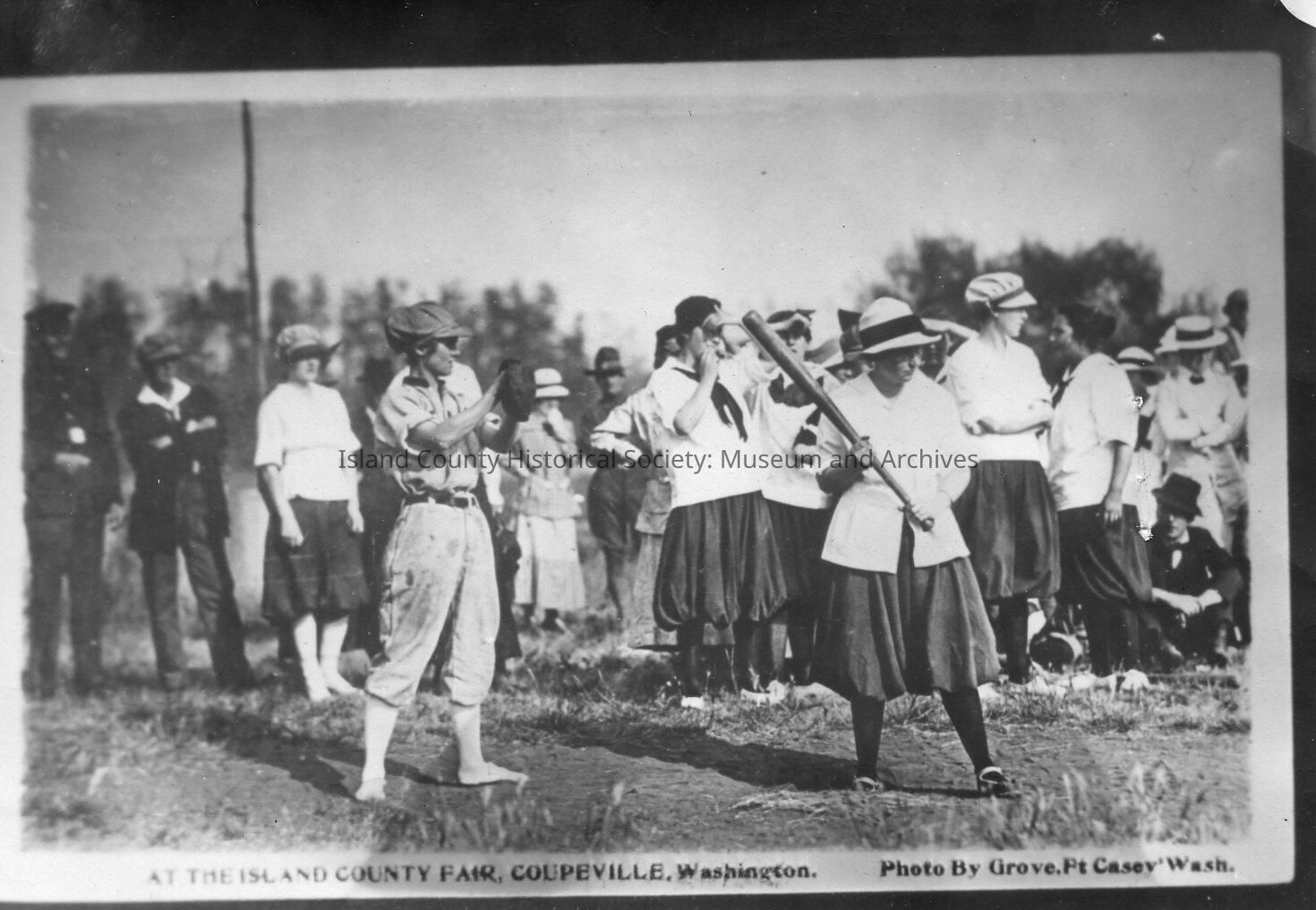 Girls' softball game at the Island County Fair in Coupeville. Players wear bloomers, long stockings and a variety of hats. Spectators stand to watch.