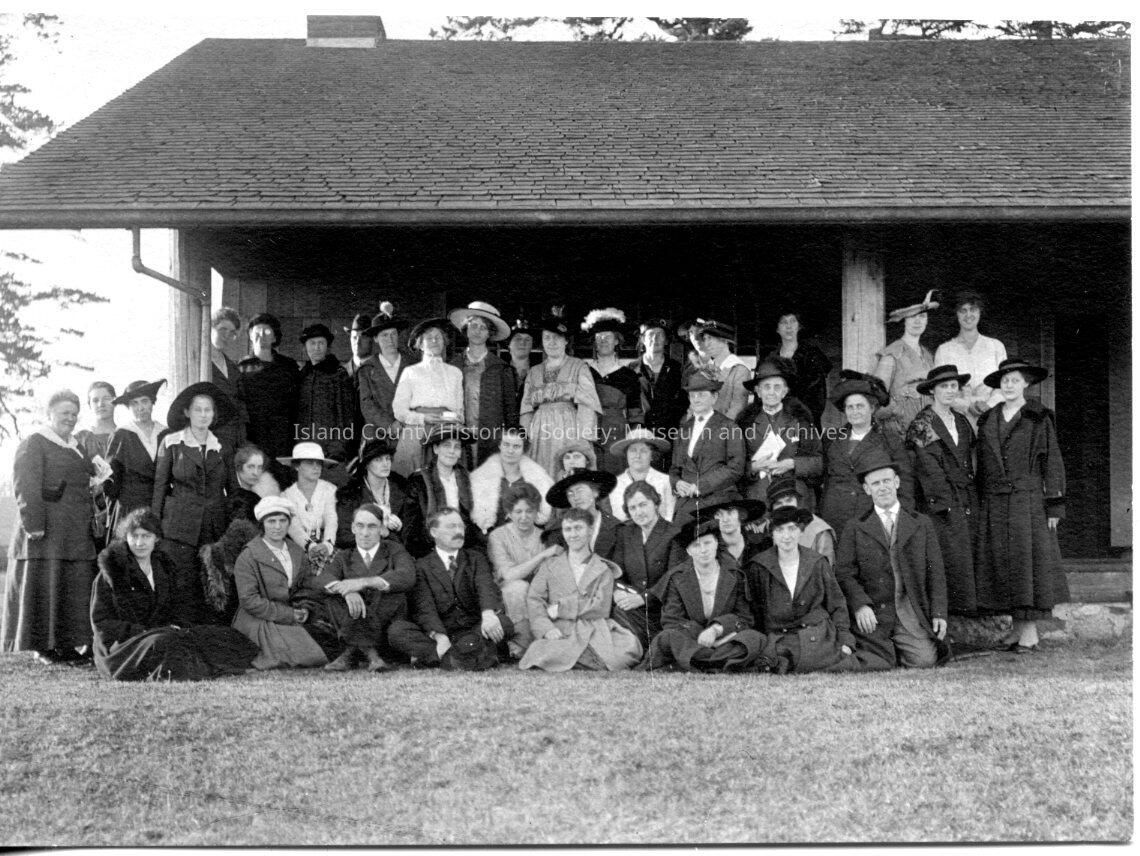 Black and white photo of teachers outdoors in front of a shelter. They are dressed in suits, dresses and large hats. Back reads: Island County Teachers' Institute 1917. Reception of Instructors and Teachers at Mrs. Pratt's (nee Lena Kohme) home. Oct. 19. 1917.Made/Created