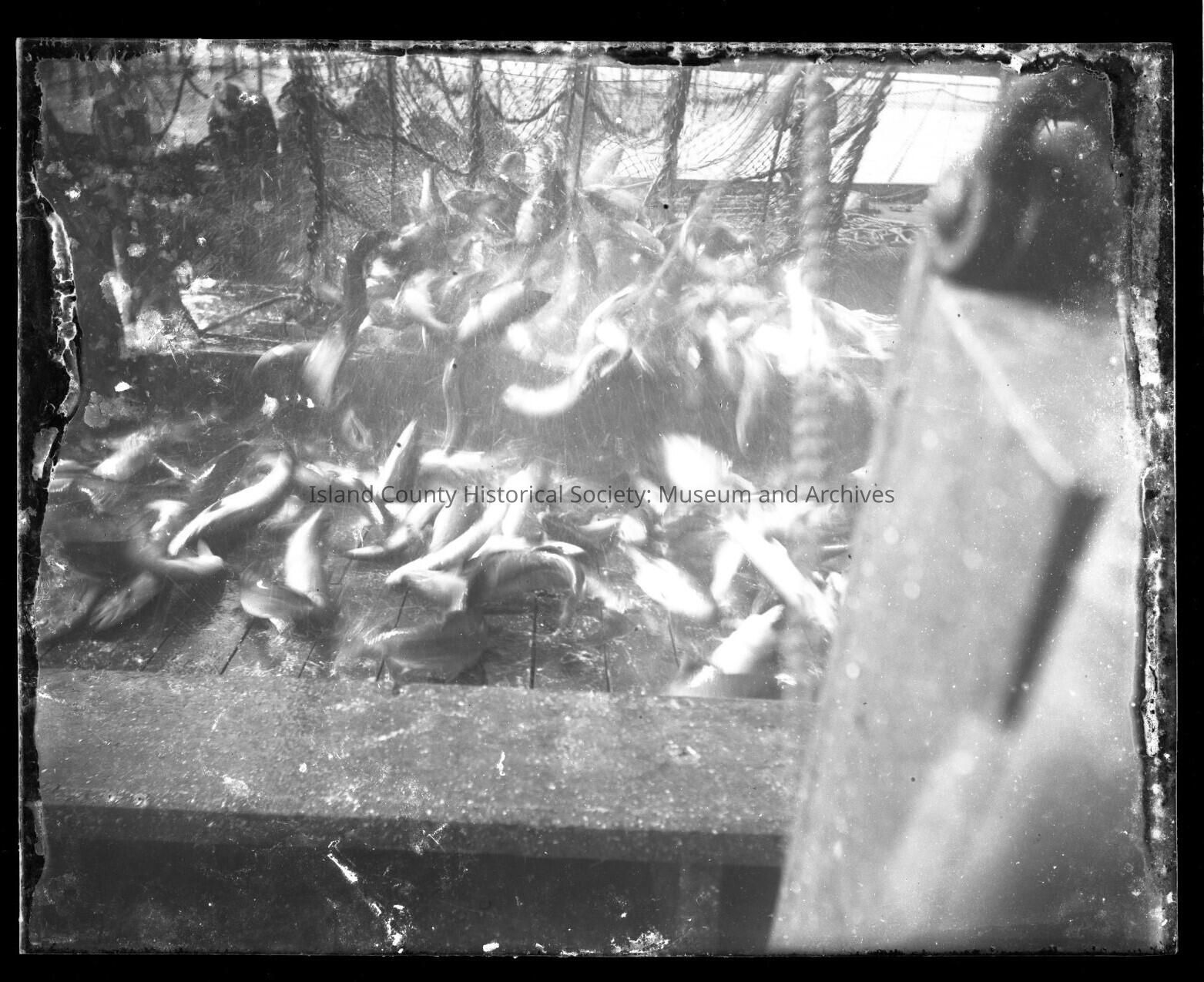 Photo of caught fish on a possible wooden pier with the fishing net in the background. There is deterioration to the middle to upper right of photo.Made/Created