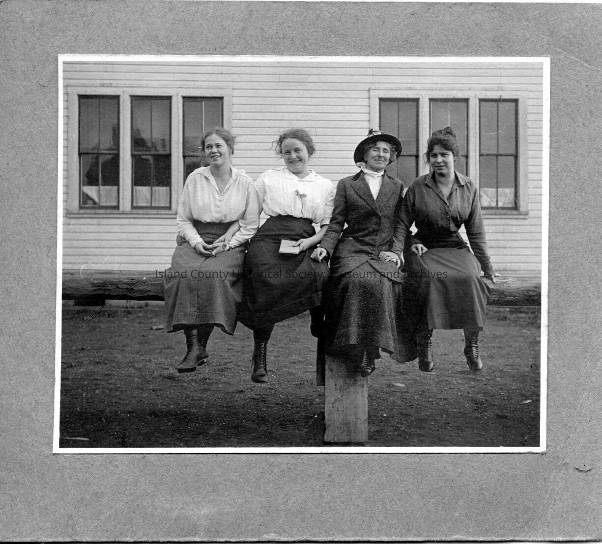 Black and white photo of 4 women sitting on play equipment in front of a school building. They are smiling. One is older and more formally dressed. Back reads: Coupeville grade teachers and Co. Supt. Black and white photo mounted on gray paper.