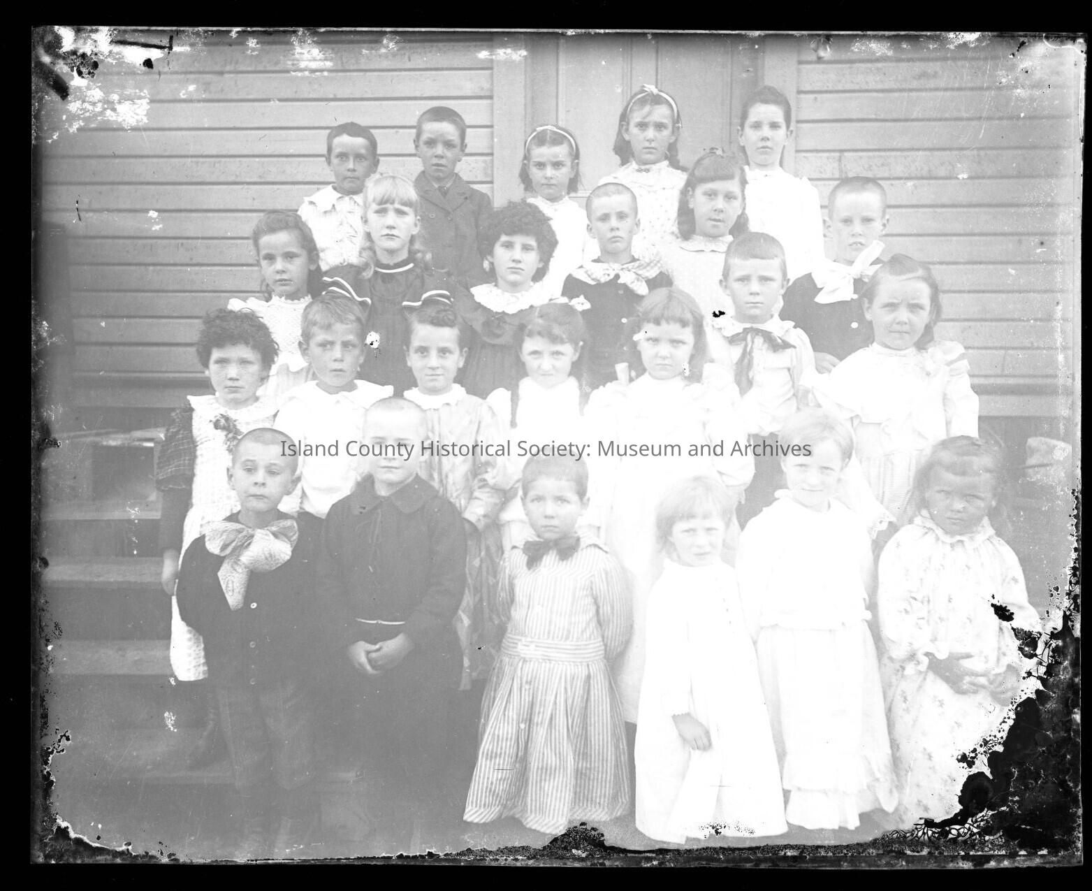 Photo of twenty four children. Seven of the children are wearing dark solid clothing and the other seventeen children are wearing light or white colored clothing. There is deterioration on the bottom right, left, and top left of the photo.Made/Created