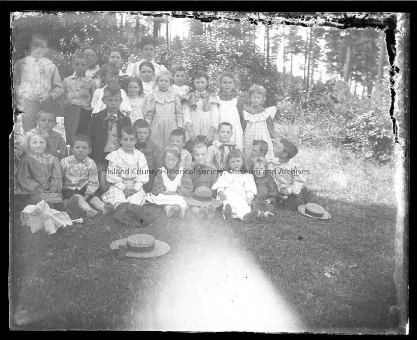 Photo of twenty six children and an adult with trees in the background. Fourteen of the children are sitting on the ground with the adult and twelve children standing behind them. There are two hats on the ground. There is deterioration on the top and right edges and white exposure to the center of the photo.Made/Created