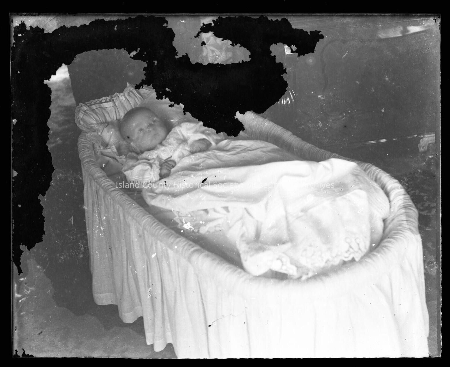 Photo of an awake baby in a crib. There damage in the photo from the left side to the middle of the photo.Made/Created