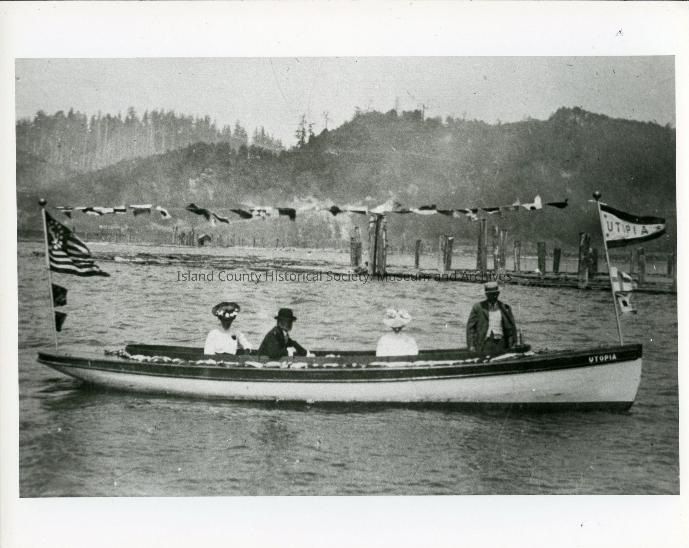Photograph of the "Utopia" boat and its four passengers. Photo likely c. 1890s.