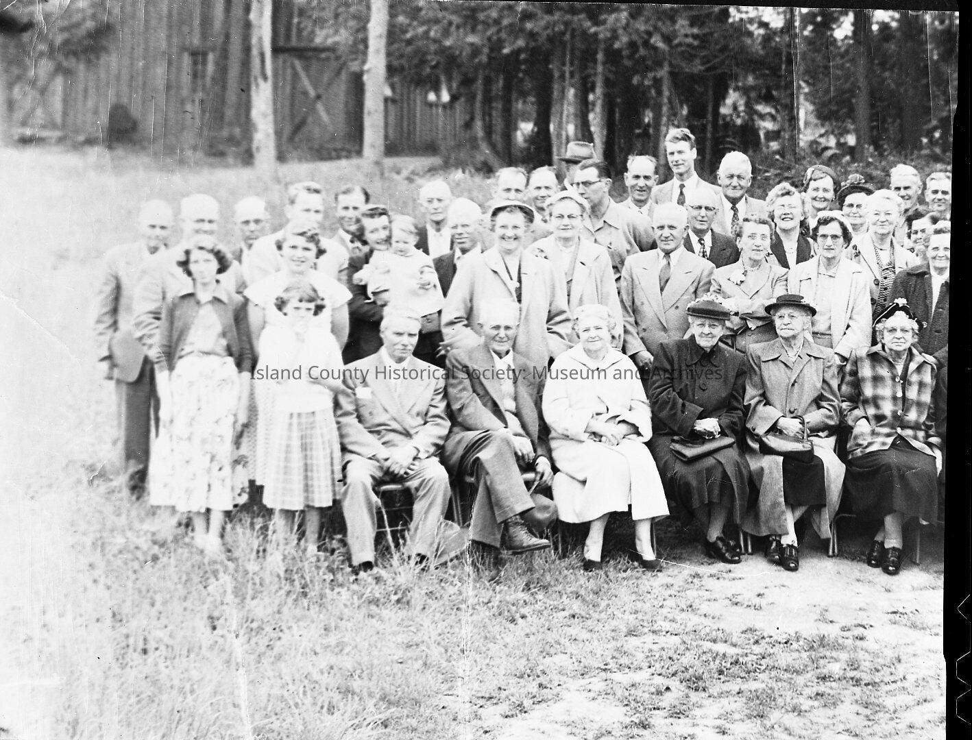 This is an image of at least 30 women, men and children sitting in front of a barn. The image is a gift of 31 film negatives of Utsalady, Camano Island received from Carol and Gloria Rieske Kerston.