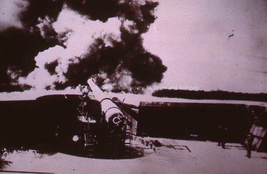 Photograph of a cannon being fired, its smoke heavily obscuring the background of the photo.