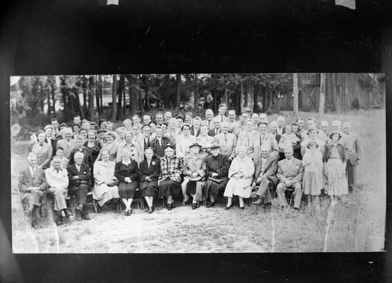 This is an image of a group of people sitting in a field. The image is a gift of 31 film negatives of Utsalady, Camano Island received from Carol and Gloria Rieske Kerston.