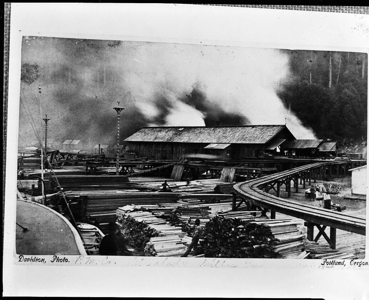 Image of the Utsalady Mill Arc lites in 1883. The image is a gift of 31 film negatives of Utsalady, Camano Island received from Carol and Gloria Rieske Kerston.