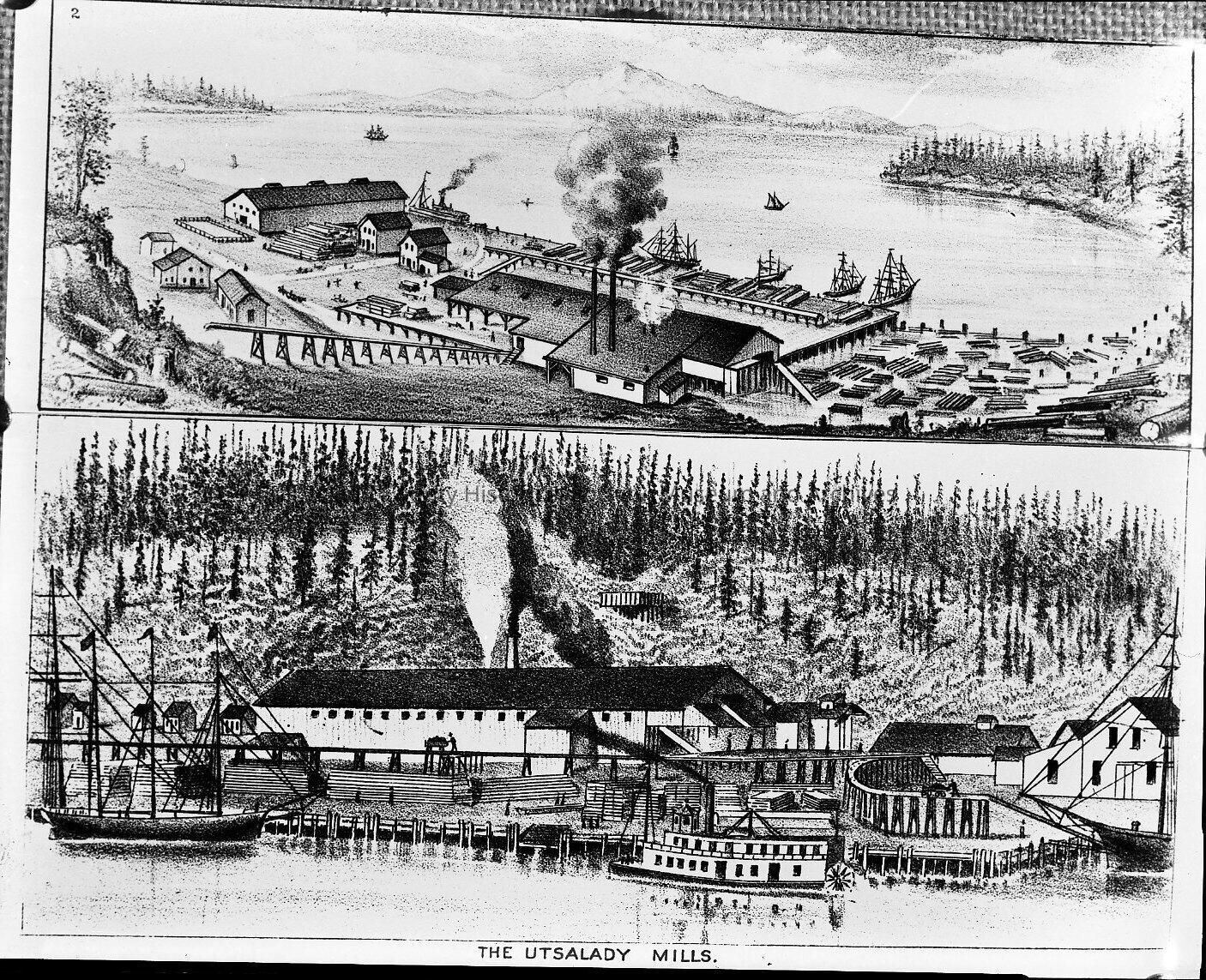 2 Lithographs of the Utsalady Mill. The image is a gift of 31 film negatives of Utsalady, Camano Island received from Carol and Gloria Rieske Kerston.