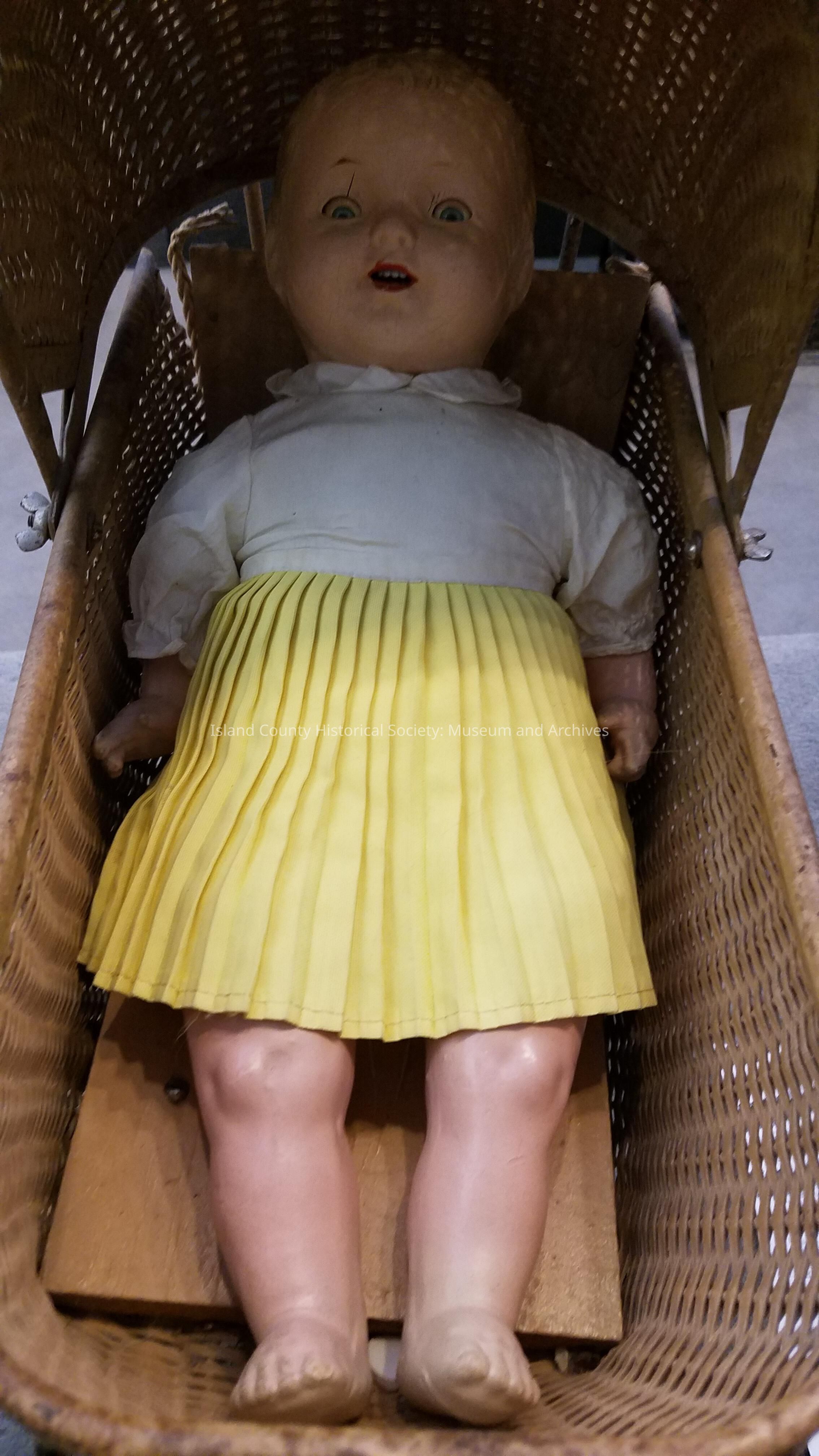 Doll Buggy and doll circa late 1920's early 1930's. Belonged to Helene Schock Munroe of Oak HarborLexicon