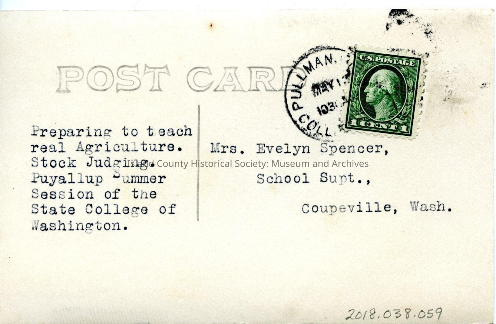 The postcard is stamped: Pullman Colleges May 13 103?AM. It is addressed to Mrs. Evelyn Spencer, Co. Supt. of Schools, Coupeville, Wash.