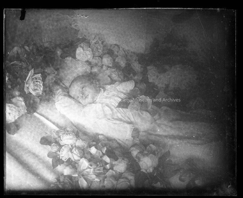 Photo of a child laying in a bed surrounded by roses. The baby is wearing a white gown, staring off into the distance. There are scratches to the photo.Made/Created