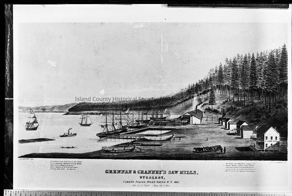 Image of the Grennan and Cranney sawmill in Utsalady. The image is a gift of 31 film negatives of Utsalady, Camano Island received from Carol and Gloria Rieske Kerston.