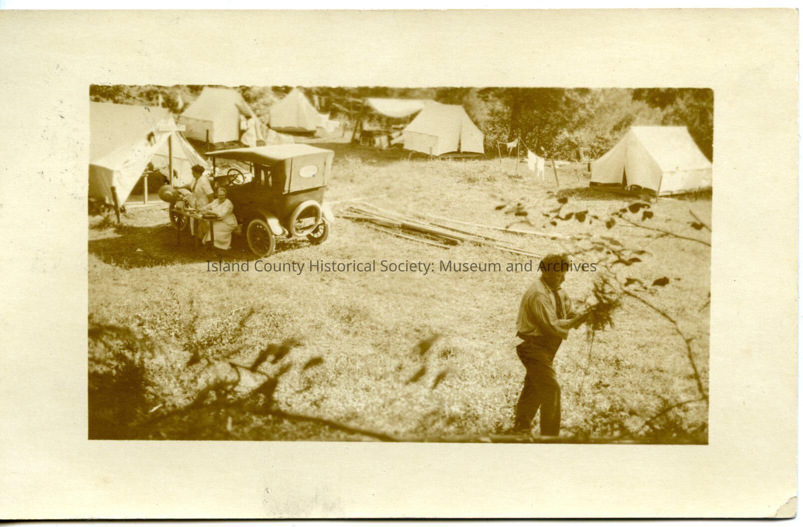 Black and white photo of a campsite. Two women are sitting on the running board of a car serving or cooking food. A man is in the foreground walking towards the right. There are tents in the background.