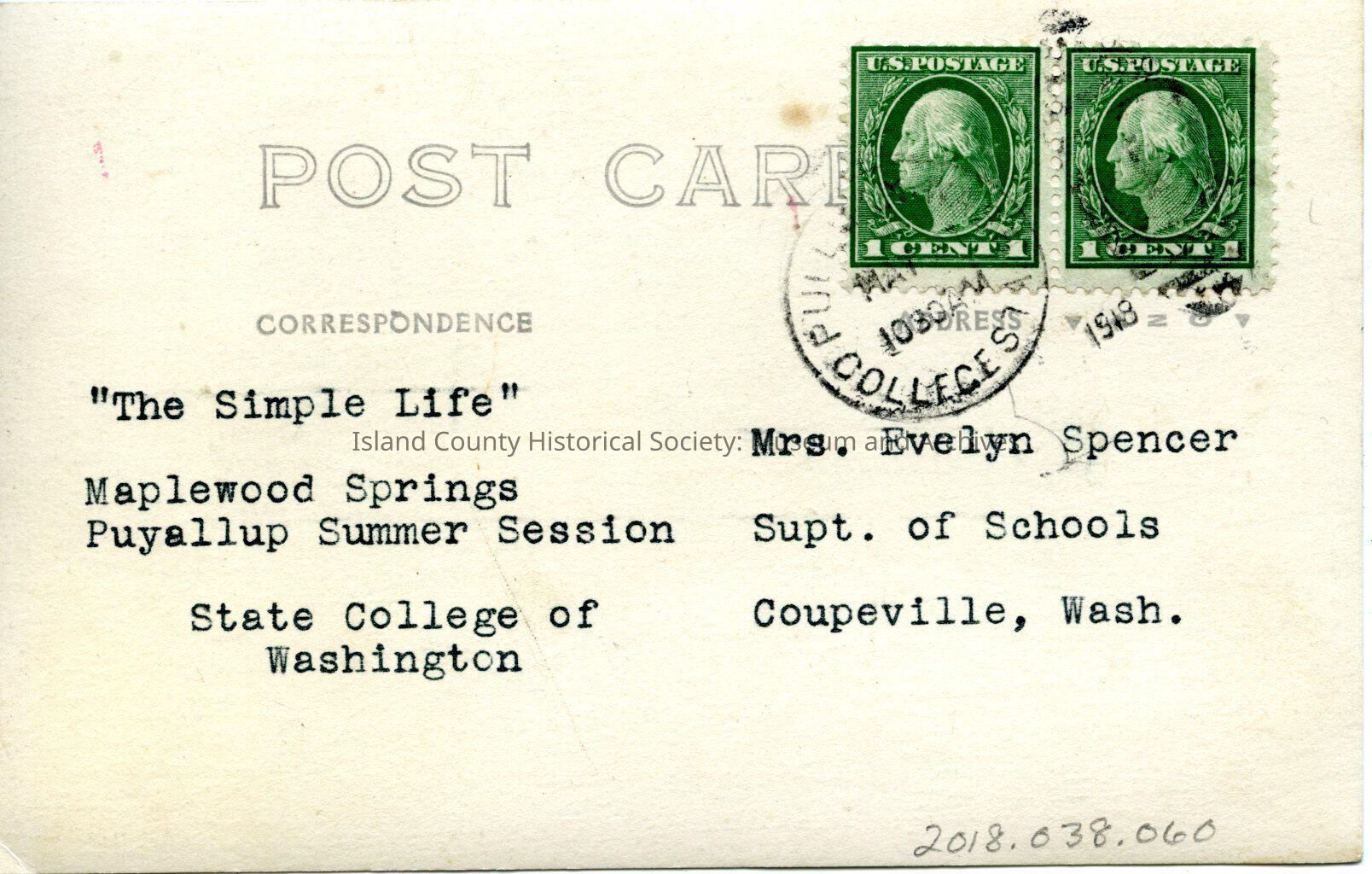 The postcard is stamped: Pullman Colleges May 7 1030AM. It is addressed to Mrs. Evelyn Spencer, Co. Supt. of Schools, Coupeville, Wash.