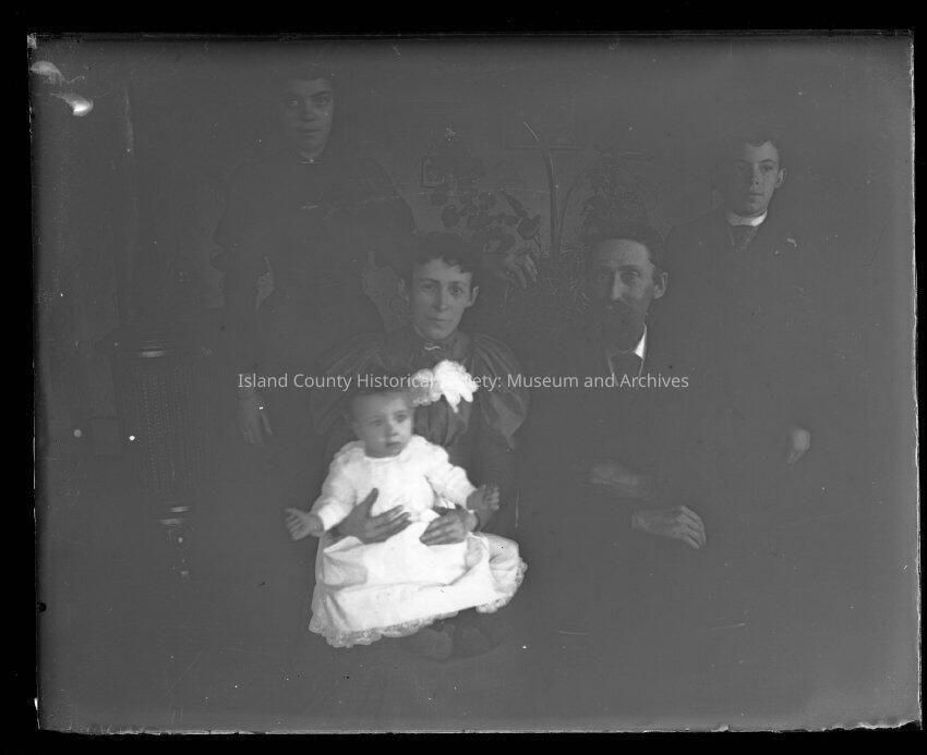 Photo of a family. The father and son are wearing suites; mother, daughter , and baby are wearing dresses. The babies dress is pure white. There is severe fading, neon green.Made/Created