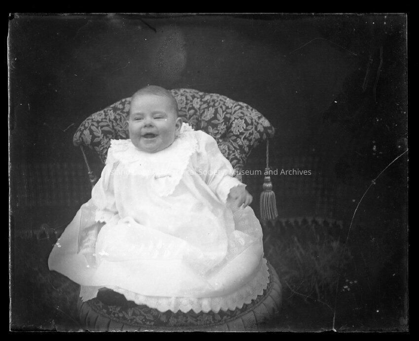 Photo of a smiling baby sitting in a plush chair. The photo has a broken corner.Made/Created
