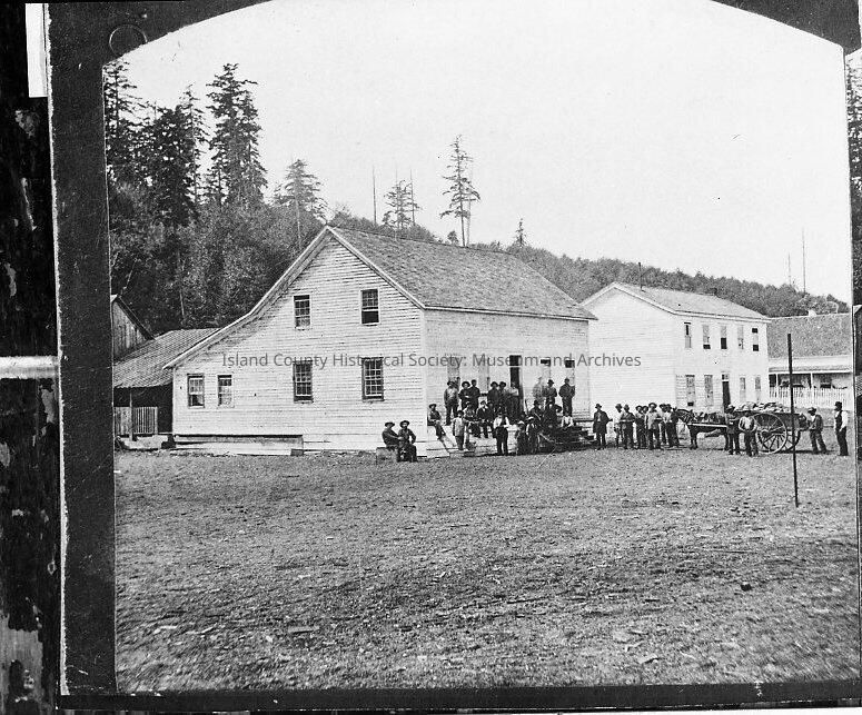 Image of a group of men posing for a photo. Could possibly be Utsalady mill workers. Names unknown. The image is a gift of 31 film negatives of Utsalady, Camano Island received from Carol and Gloria Rieske Kerston.