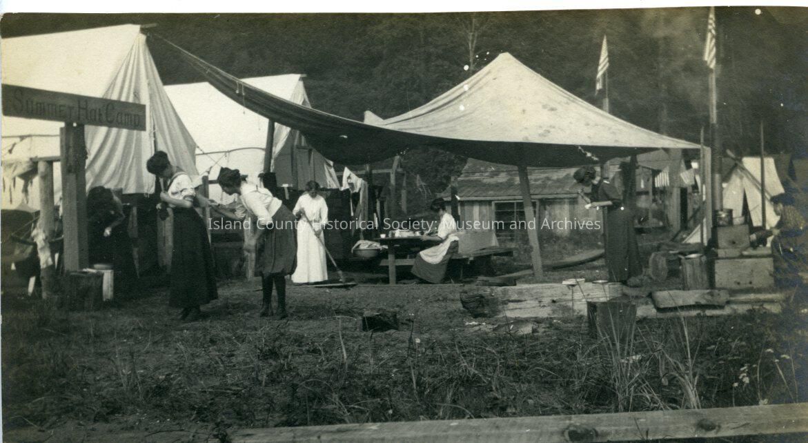 Black and white photo of a large camp like setting with tent shelters erected and shed, and two American flags upper right corner. Wooden sign left side of photo states: "Summer Hat Camp". Picture shows women in camp sweeping and cleaning up. Two small flags are in the lower right corner.