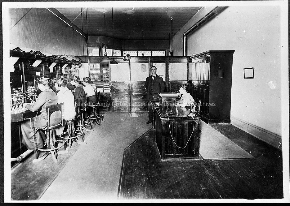 Image of what appears to be a telephone call center. There are 5 women telephone operators sitting a desk and one man standing in the center of the room next to a desk. The image is a gift of 31 film negatives of Utsalady, Camano Island received from Carol and Gloria Rieske Kerston.