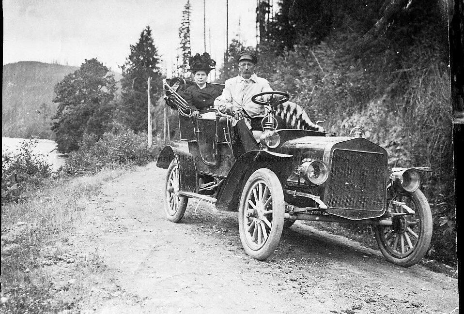 Image of a man and woman in a car stopped on the side of the road. It appears they have stopped in this area to have their picture taken. A few trees and water can be seen in the background. The image is a gift of 31 film negatives of Utsalady, Camano Island received from Carol and Gloria Rieske Kerston.