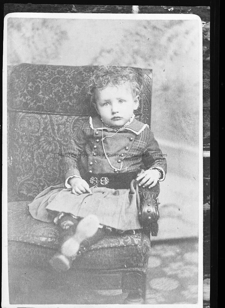Professional photo of a small child sitting in a chair. Name unknown. The image is a gift of 31 film negatives of Utsalady, Camano Island received from Carol and Gloria Rieske Kerston.