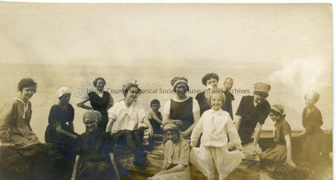 Black and white photo of a group of women and children sitting on driftwood on the beach posing for a photo. Shows period clothing and hats.