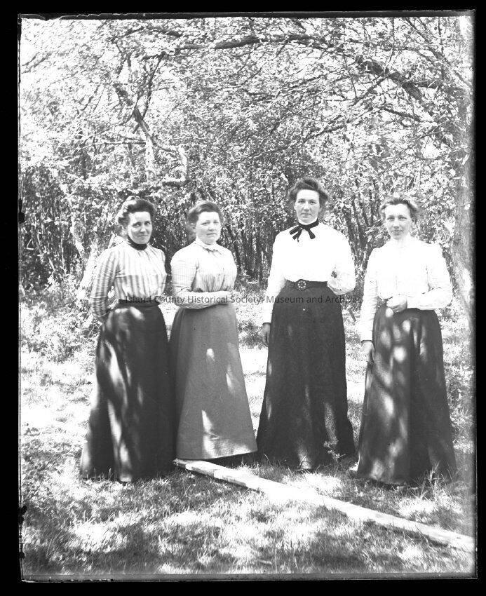 Photo of four women posing in a wooded area. The women; starting from left to right; is wearing a verticle lined button shirt with a dark skirt, a solid colored button shirt and a light colored skirt, and lastly the two to the right are wearing white button shirts, the one to the far right is wearing a lighter shaded skirt than the other.Made/Created