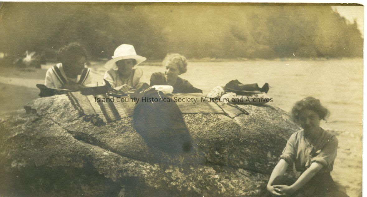 Black and white photo of four women sitting around a large rock on a beach. Blanket stretched out on a large beach rock for a picnic. Wooded ridgeline meeting the water in the background.
