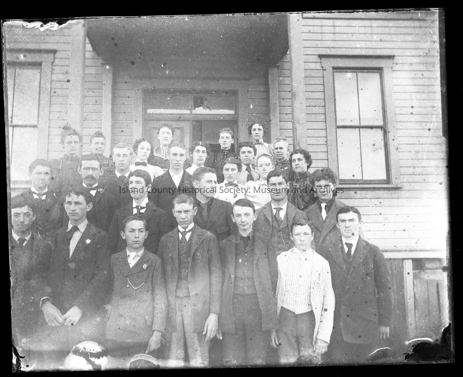 Photo of twenty seven children and adults standing in front of a building. The front two and a half rows are made of men and boys and the last three and a half rows are made of up woman and girls. There is corroded edges at the top left and bottom right as well as fading in the photo.Made/Created