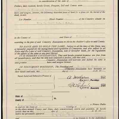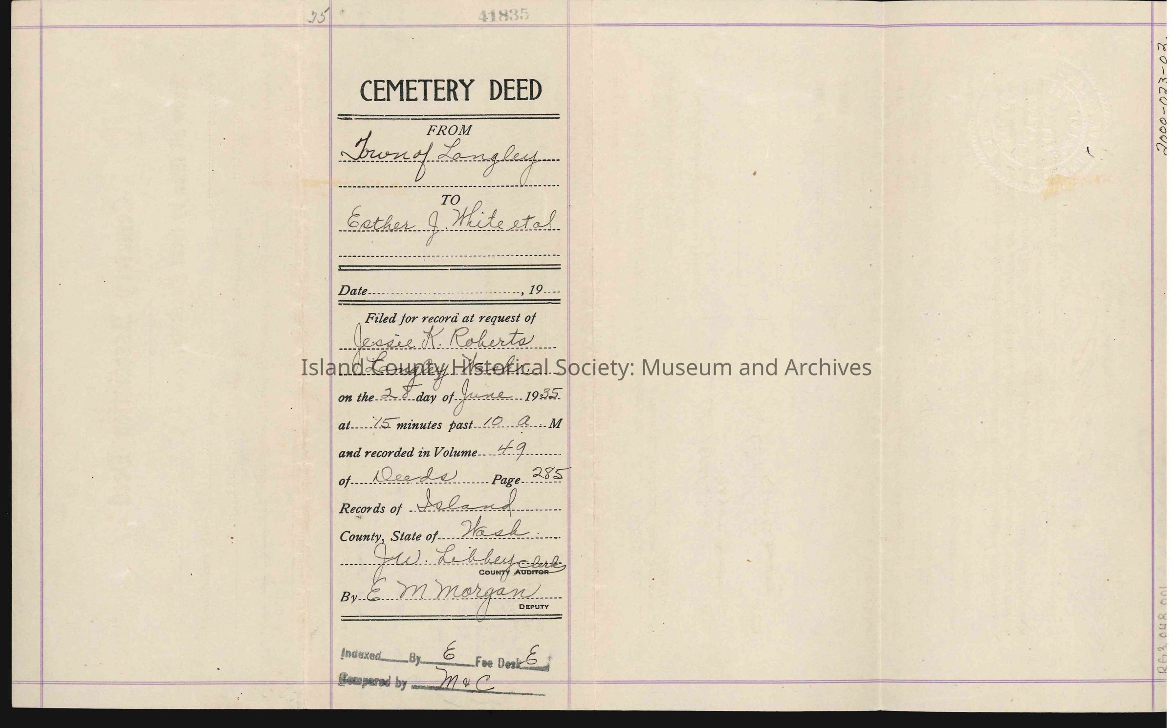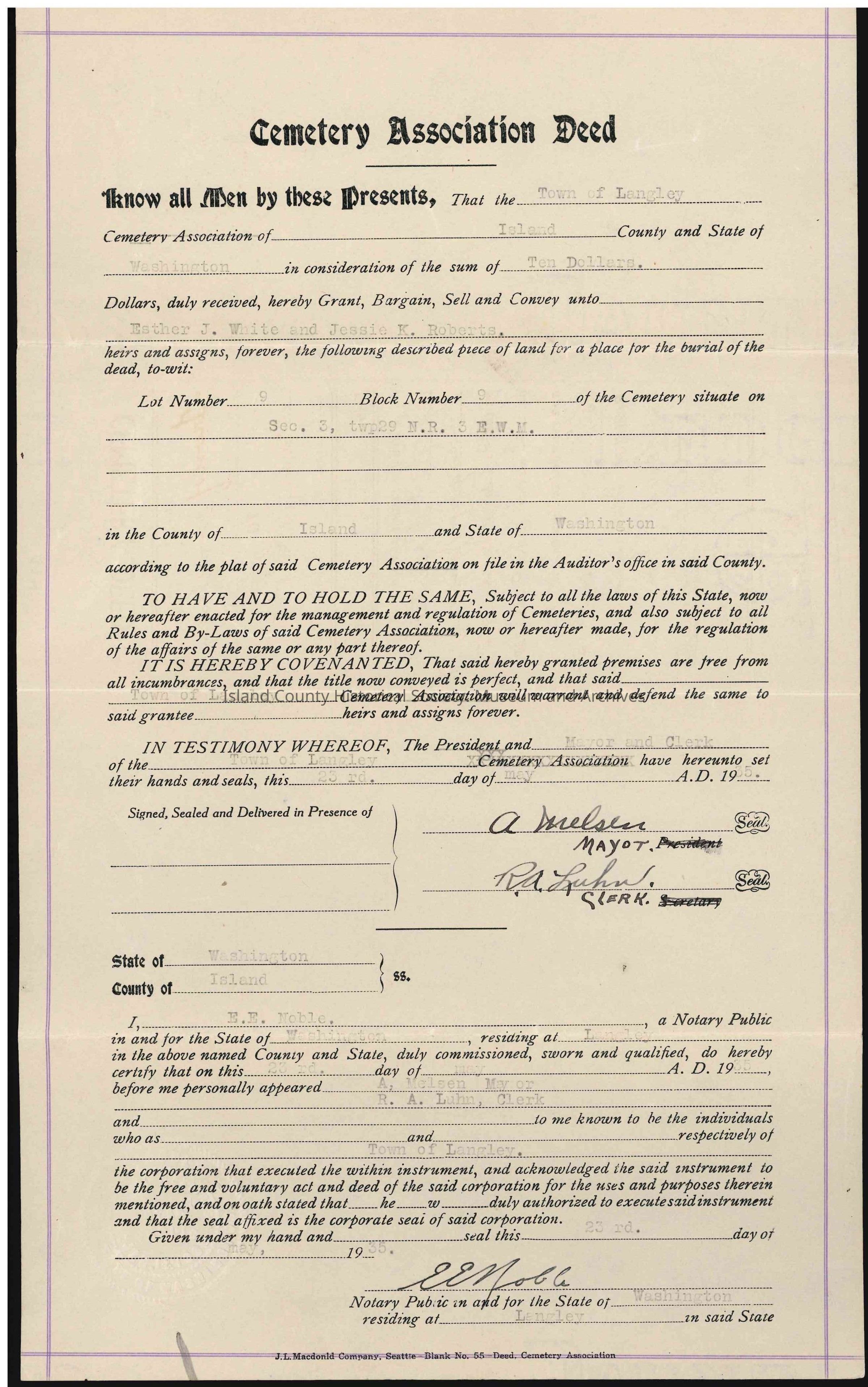 Cemetery Deed from Town of Langley to Esther J. White and Jessie K. Roberts a cemetery plot in the Town of Langley, dated 28 June 1935.