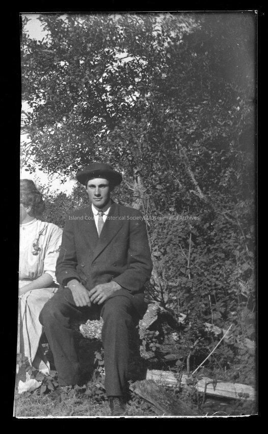 Photo of a man in a dark colored suit sitting on a tree log next to a woman. The woman is slightly out of frame, cutting herself in half in the photo. There is trees in the background. There is a broken piece of the photo.Made/Created
