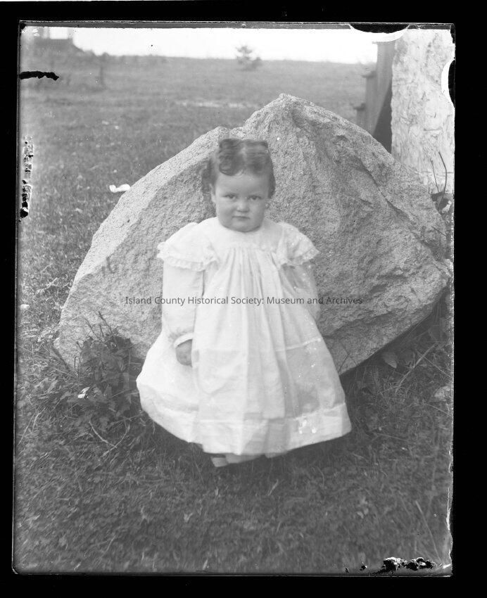 Photo of a young girl in a white dress standing in front of a rock on a flat grassy plain. There are scratches on the photo.Made/Created