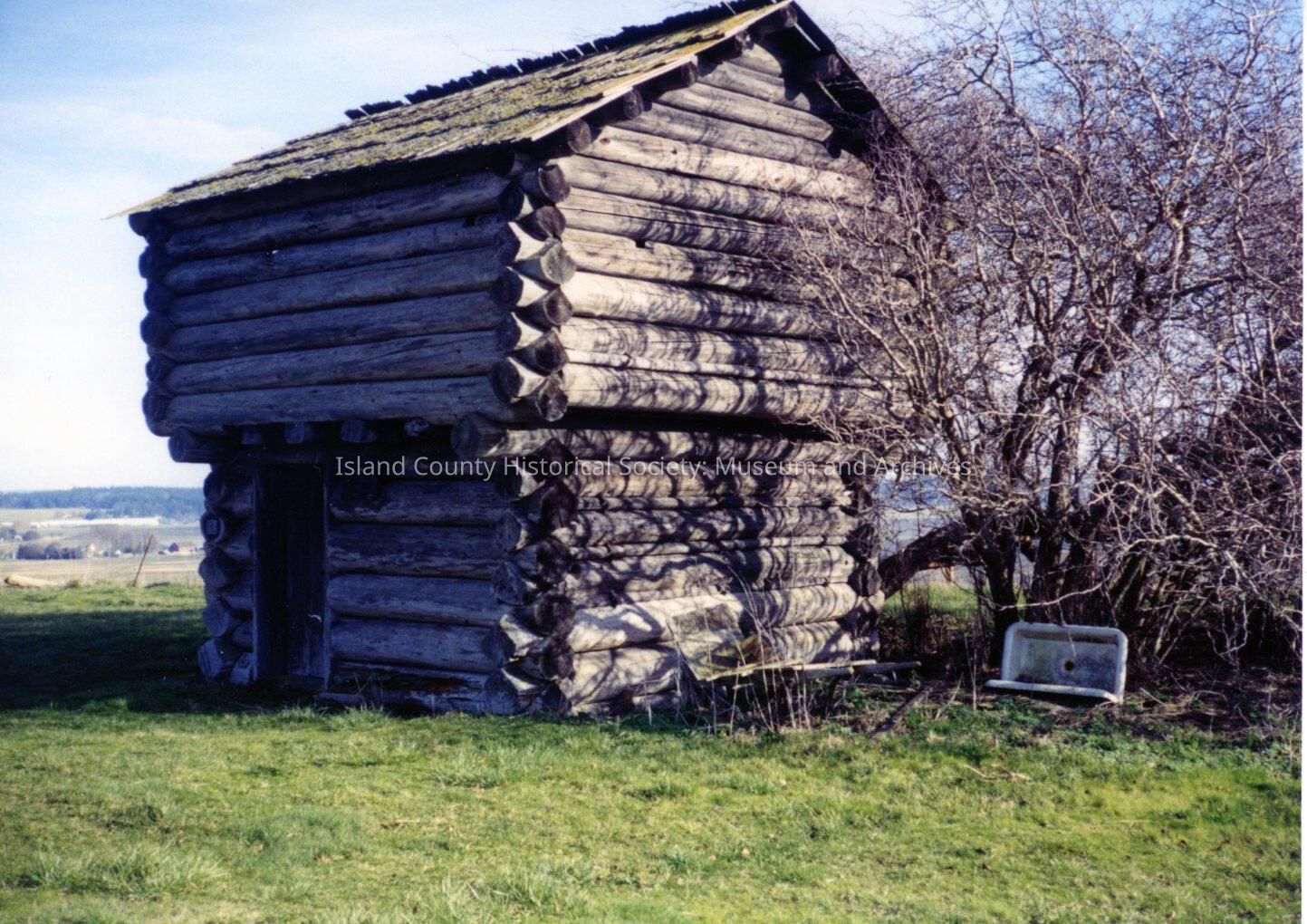 This color photo shows the Ebey Blockhouse located on Ebey's Prairie. The blockhouse is located close the the Jacob Ebey House and both are surrounded by the fields of Ebey's Prairie. The view from the blockhouse includes much of Ebey's Prairie, Ebey's Landing and the Puget Sound.