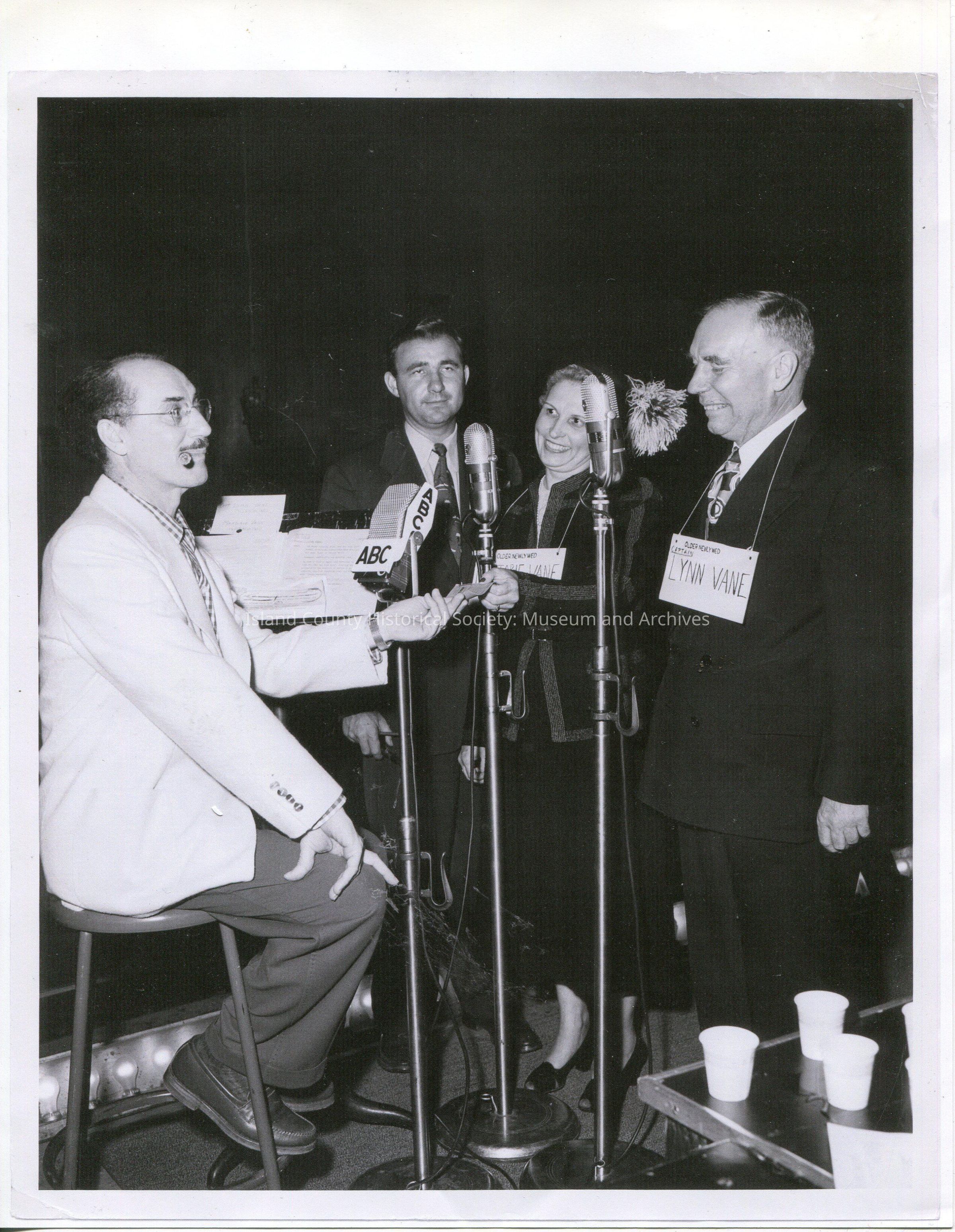 A photo of four people standing around microphones. The man and the woman on the right are wearing name tags, Lynn Vane and Marjorie Vane (obscured) - they are a couple from Coupeville. A man sits on a stool on the left- Groucho Marx, the radio show host. In front of him is a mic labled 'ABC.' A fourth guy stands in a suit in the background.