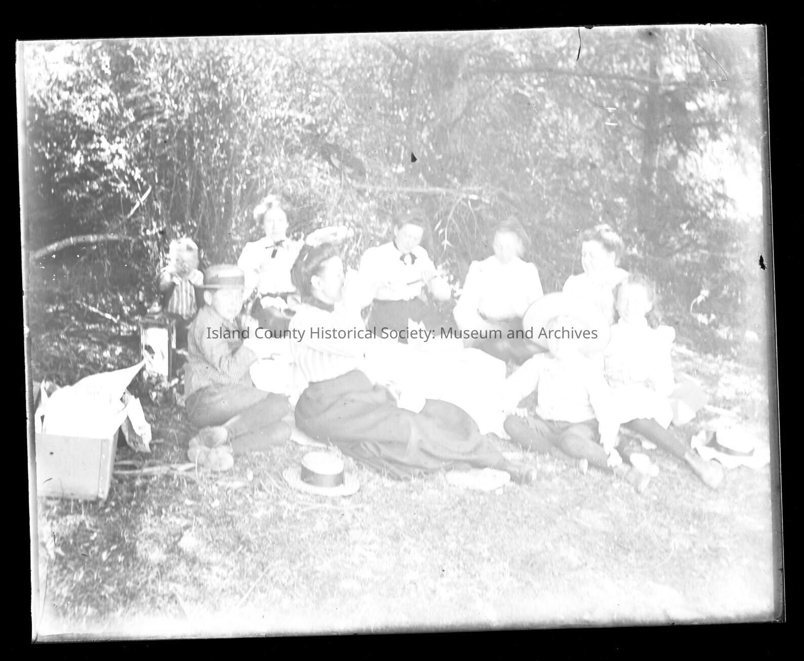 Nine people (4 children: baby, 2 boys, girl) (5 adult women) sitting outside having a picnic. Possible basket on left side of image. Two hats on the ground. Women in long skirts and blouses; wearing hair up in buns. ~Turn of the 20th century.Made/Created