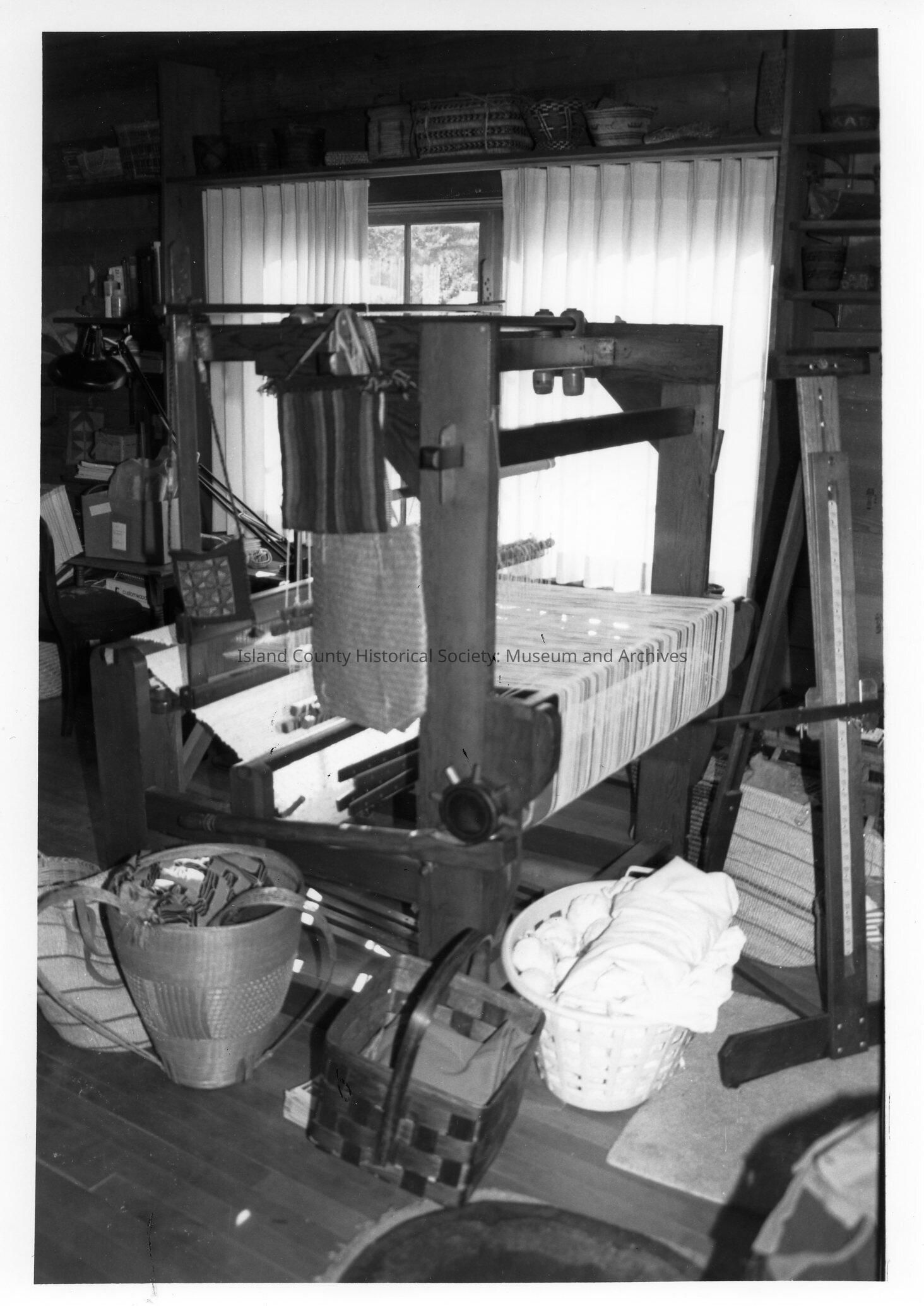 Black and white photo of Mary and Maude Fullington's loom. In the picture you see a lot of woven baskets and other items. The loom appears to be at Mary's home and written on the back of the photo is Mary & Maude Fullington's loom.