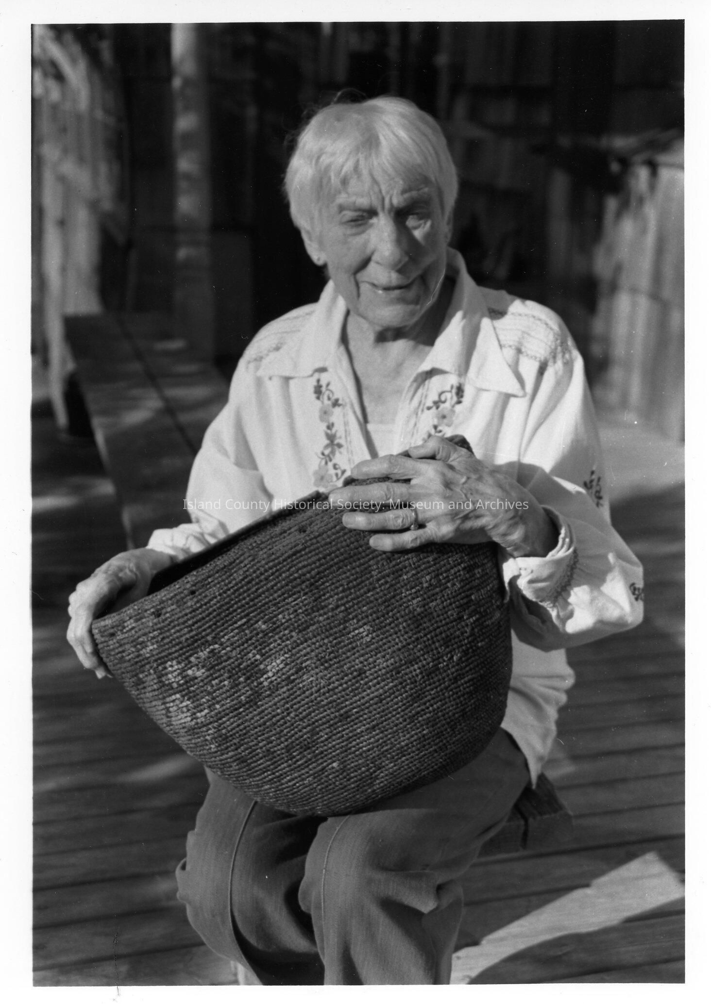 Black and white photo of Mary Fullington holding a native american basket. In the photo she appears to be sitting outside and she is wearing a white blouse with embroidery.