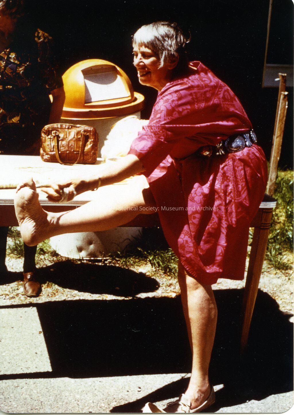 Color image of Ann Meerkerk standing outside. In the photo you can see a yellow trash can, a brown purse and Ann is wearing a red dress. It appears Ann is posing against a table with her leg up. **digital copy only**