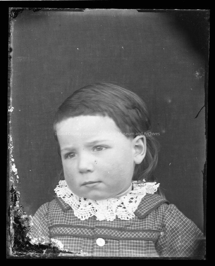 Photograph of a little girl. She is looking to the left and is not smiling. She has long hair in the back and short hair in front (no bangs). She is wearing a dress (it has a lace collar; the fabric is checkered; one button visible).Made/Created