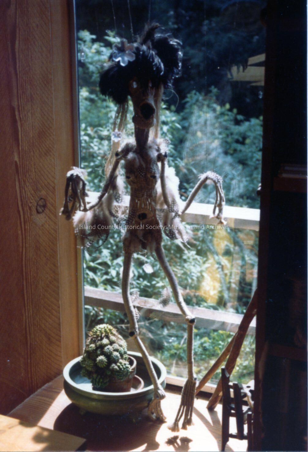 Color image of Ann Meerkerk's Art. The image appears to be a sculpture made out of yarn and it is a woman. In the photo next to the scuplture is a succulent plant. **digital copy only**