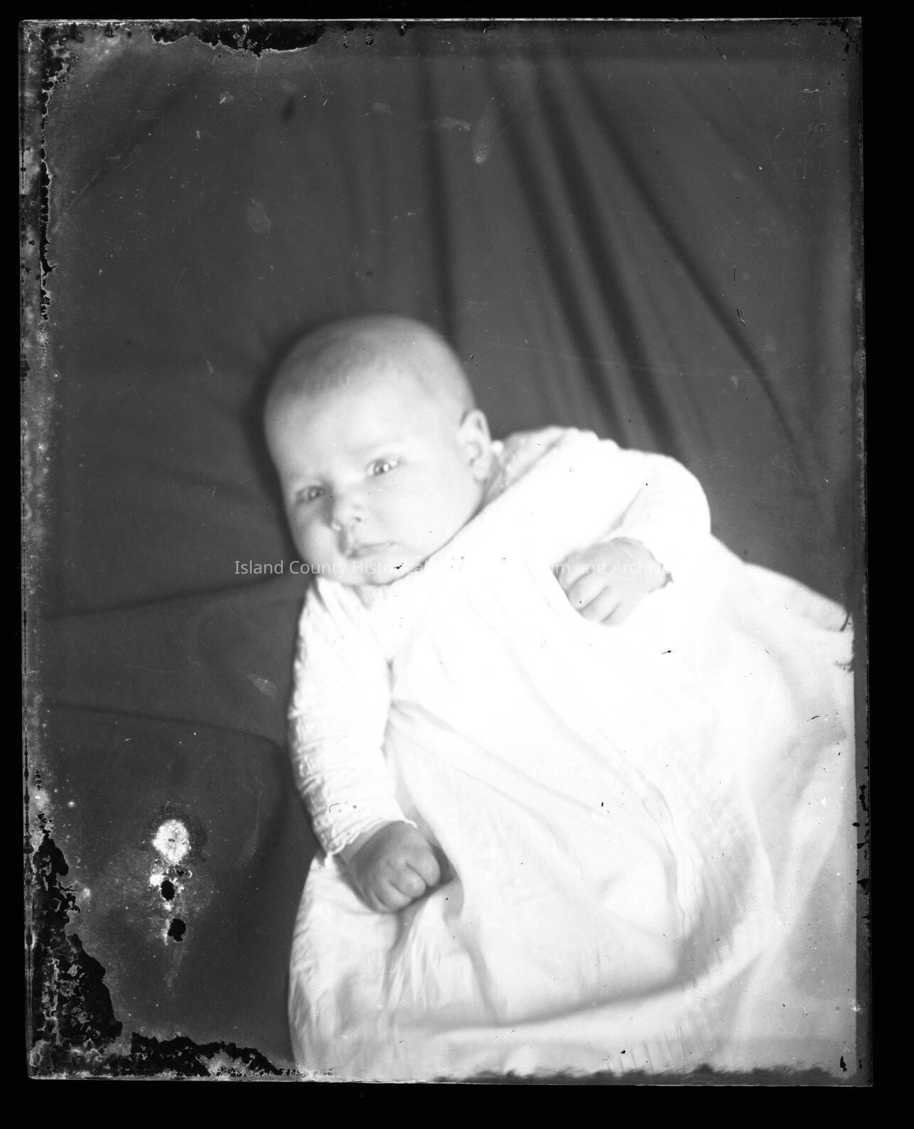 Infant/baby wearing a white gown with long sleeves. Left arm down, right arm curled up on chest. Infant/baby is looking to the left. Infant/baby is laying on dark fabric/cloth.Made/Created