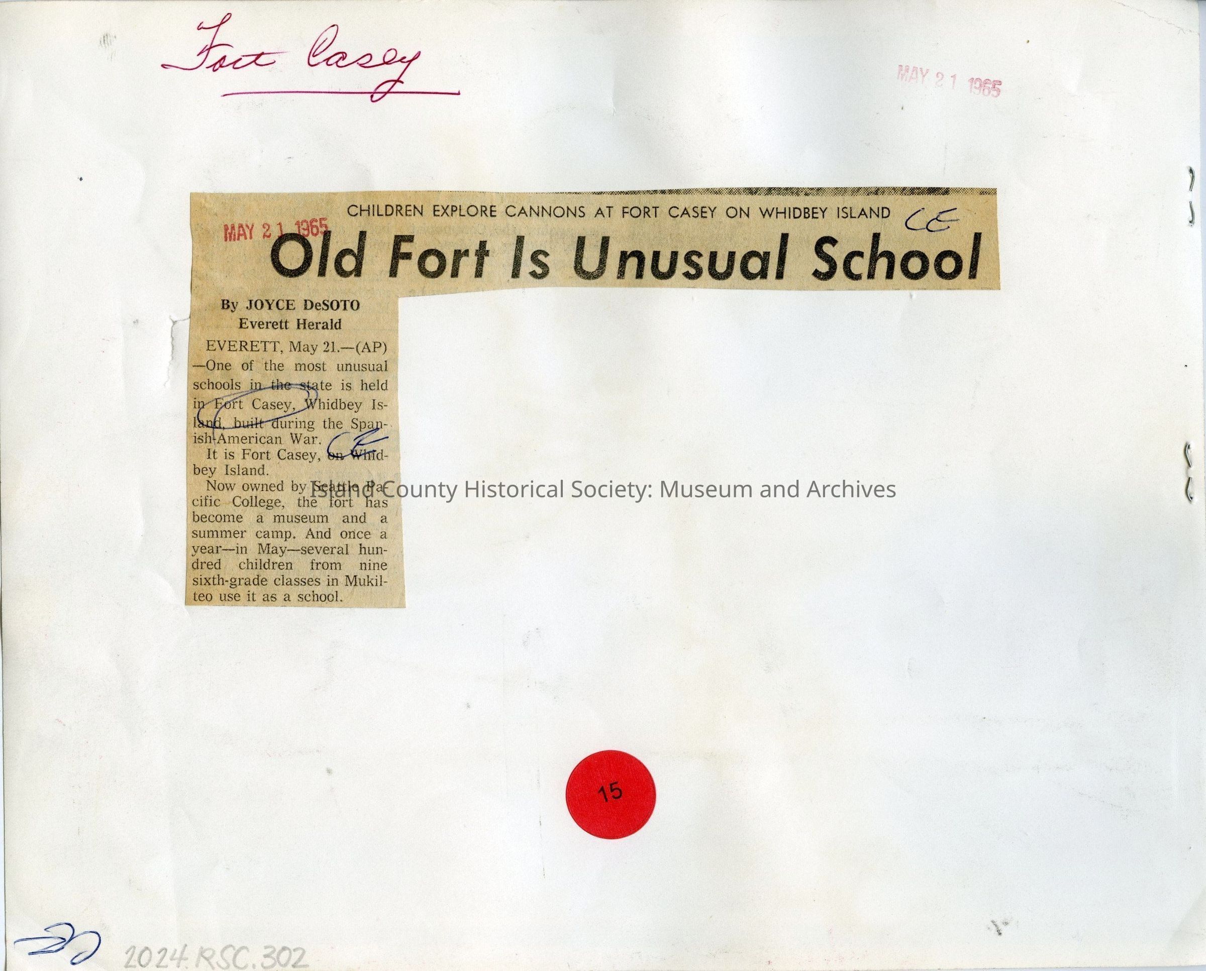 Photograph depicting children playing on a gun emplacement at Fort Casey, c. 1965. A short newspaper clipping pasted on the reverse of the photo describes how Fort Casey acts as an educational outlet for children from Mukilteo schools.Photograph Details