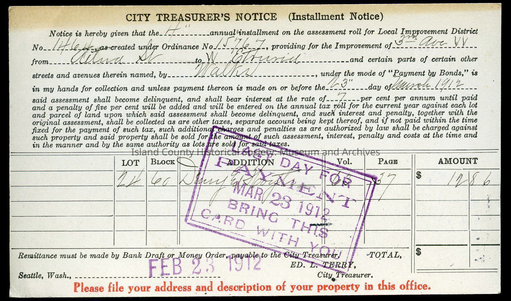 City Treasurer's Notice - Hattie S Race, 1912