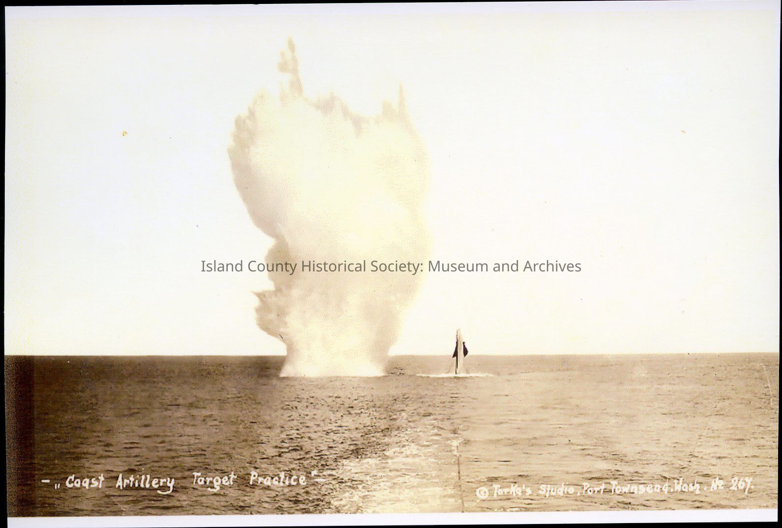 Photograph of an artillery weapon's fire into the water as target practice. The artillery weapon was fired from the battery worth at Fort Casey. The camera is facing north and the target is being towed toward the south into Admiralty Inlet. The artillery fire captured in this image is considered "on target" as it was close (to the target), but did not destroy it. C. early 1900s.Photograph Details