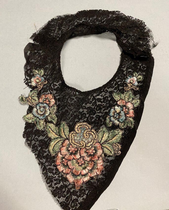 Black lace Collar with colorful floral embroidered applique. Fraying along edges.